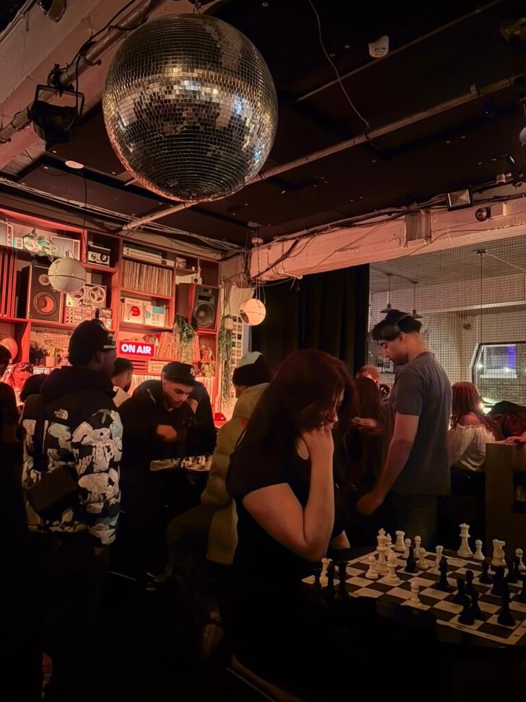 From Wednesday to Monday in the trendy east London venue, house music blares from the decks of aloof DJs while creatives sip on Blood Orange and Hot Honey Margaritas and discuss the pros and cons of five-toe shoes. But on Tuesdays, tables are cleared and topped with roll-out chess boards. The music is more ambient, playing at a level that allows for conversation but invites focus. Silence is never awkward across the chess board.