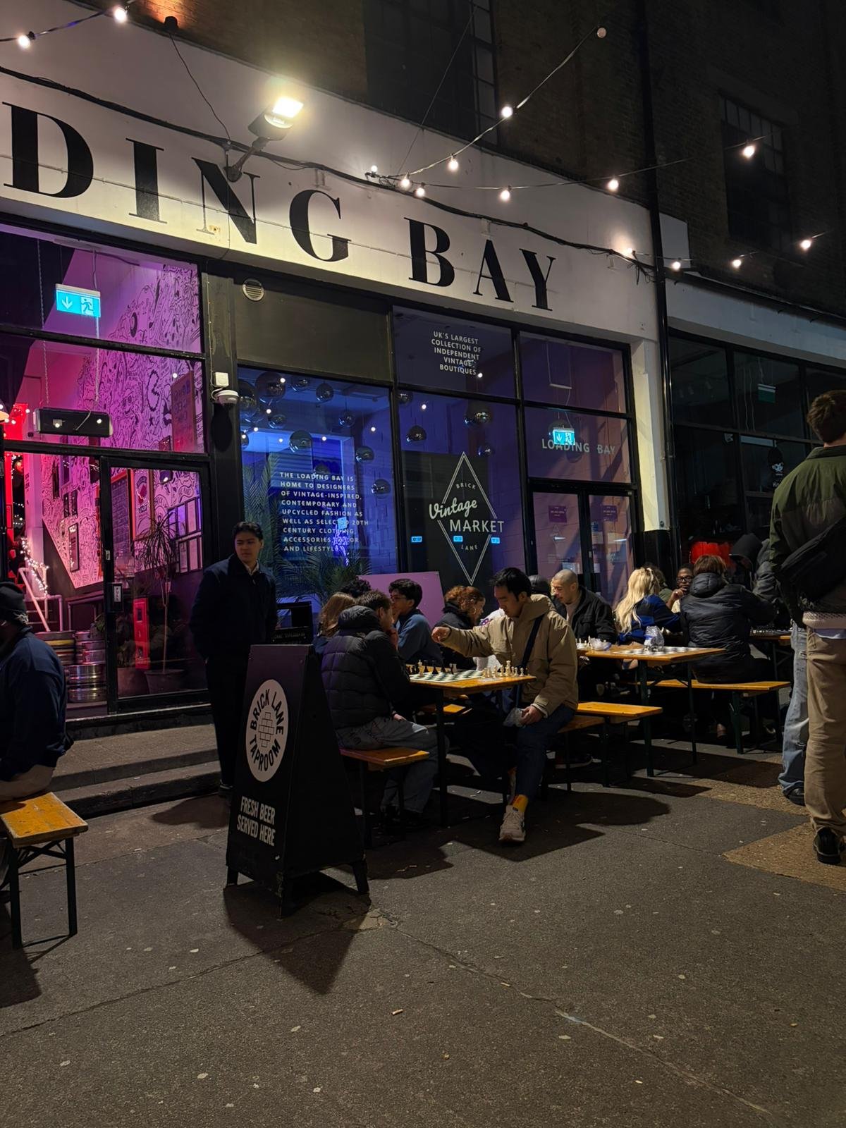 Walking up to the bar, all preconceived caricatures of a chess player in my mind were crushed. The venue was filled with well dressed, well groomed young people, playing chess with friends and strangers alike. The event is so popular that players sprawled from inside the bar out onto the street – half of Dray Walk was filled with picnic style tables and benches, with chess fanatics bundled up in coats and scarves, braving the winter cold to dabble with the checkered board.